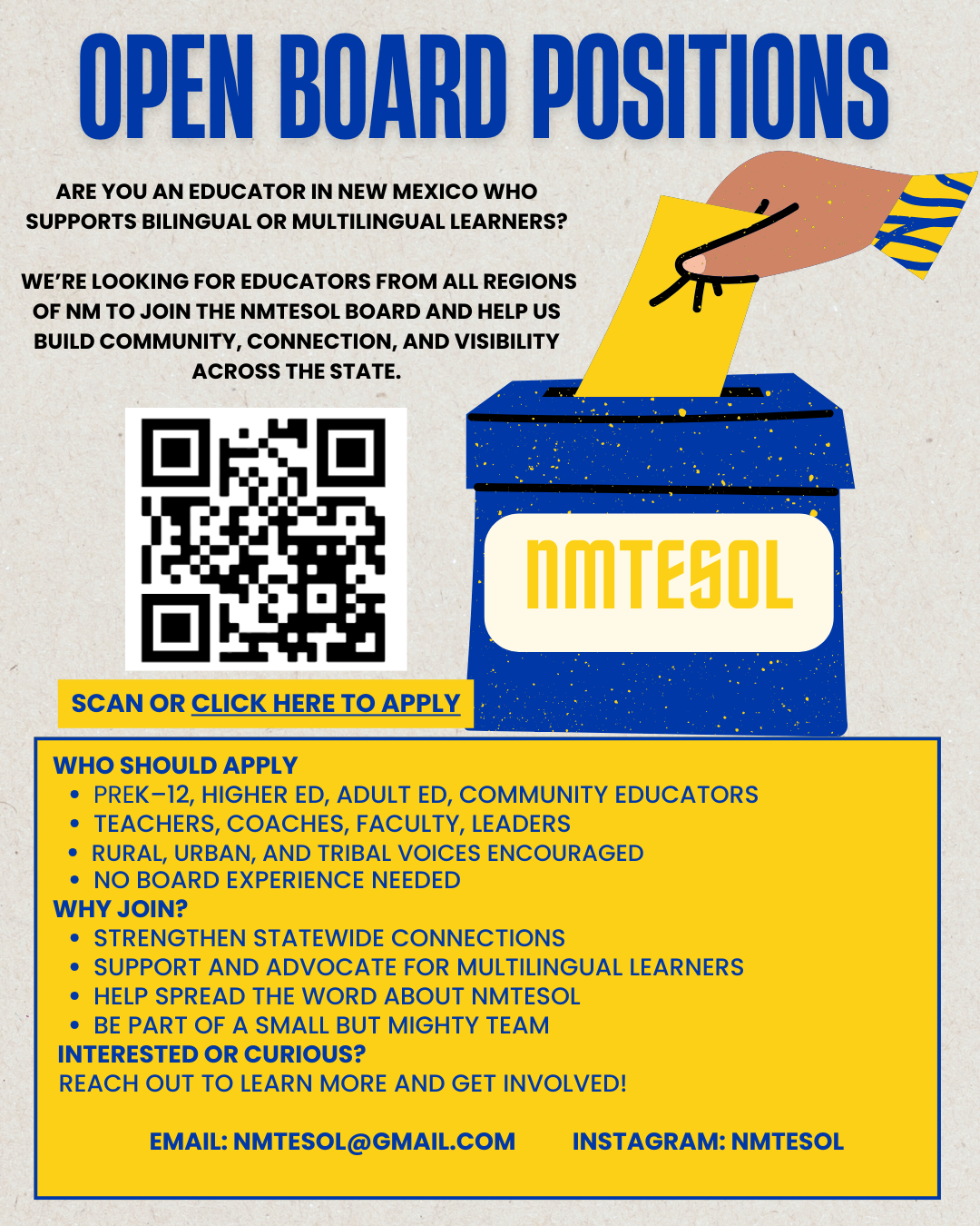 For more information on these positions and how to get involved, feel free to reach out at nmtesol@gmail.com.