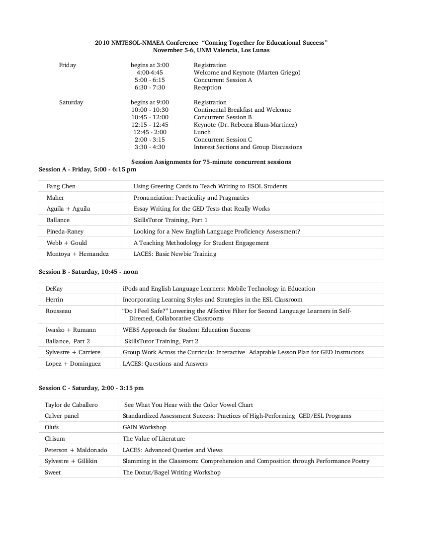 Conference Schedule October 30, 2010October 30, 2010 NMTESOL Uncategorized Share this: Click to print (Opens in new window) Print Click to email a link to a friend (Opens in new window) Email TweetLike Loading... Related