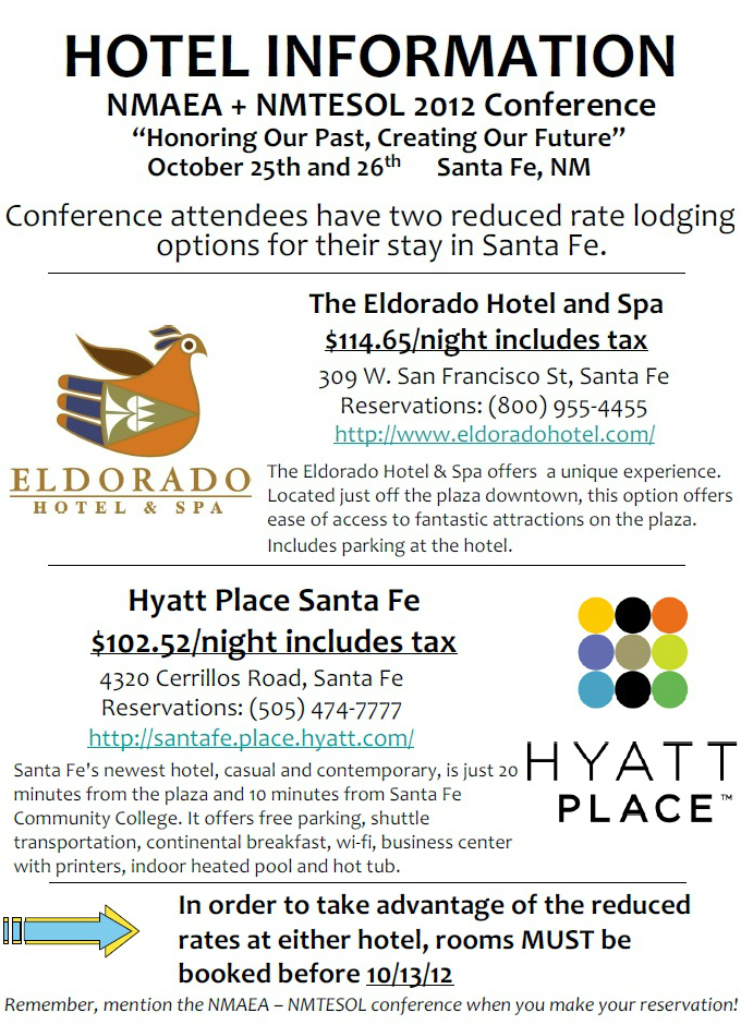 2012 Conference – – Hotel Information September 24, 2012March 5, 2013 NMTESOL Uncategorized Share this: Click to print (Opens in new window) Print Click to email a link to a friend (Opens in new window) Email TweetLike Loading... Related
