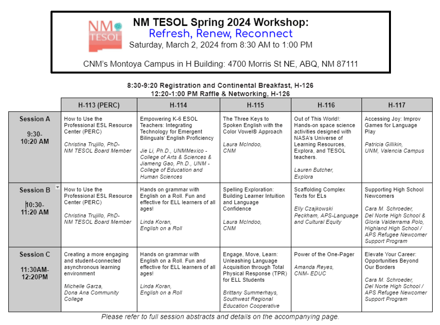 6 Days Away!!! February 25, 2024January 8, 2025 NMTESOL Uncategorized We are excited to see everyone on Saturday, March 2nd! Click here to view Program and more information about each session. Share this: Click to print (Opens in new window) Print Click to email a link to a friend (Opens in new window) Email TweetLike Loading... Related